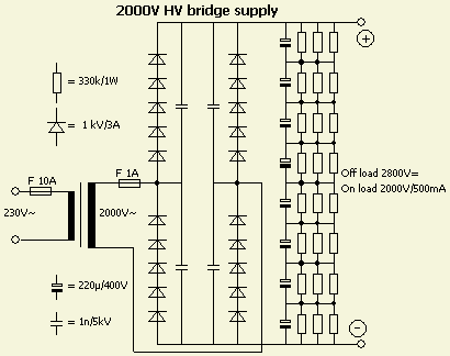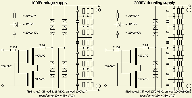 Ook met een 220 ÷ 380 V transformator is een behoorlijke voeding te maken. Houdt er wel rekening mee dat met ons huidige elektriciteitsnet (± 228V~) er aan de secundaire kant een hogere spanning gegenereerd wordt. Bij mijn experimentele voeding op het plankje werd een 380 ÷ 220 V trafo ingezet. Als zoiets gebruikt wordt voor een 220 ÷ 380 V transformatie, ontstaat er aan de secundaire kant een lagere spanning dan 380 V. Bij volle belasting werd aan de secundaire kant een spanning van 2 kV gemeten.