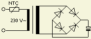 Er wordt ook wel een NTC weerstand in de primaire kant van een trafo aanbevolen als inschakelvertraging. Het inzetten daarvan hangt af van het type transformator. Veel trafo's voor HF versterkers hebben een behoorlijk lage gelijkstroomweerstand (Rp) aan de primaire kant. Dat kan wel 2 à 10 Ω zijn. Een NTC van 1 Ω effectief onder volle belasting zal dan bij Rp =10 Ω een spanningsverlies geven van 10 %. Vertaalt naar de secundaire kant van een transformator, betekent dat een spanningsval van ongeveer 100 V onder volledige belasting.