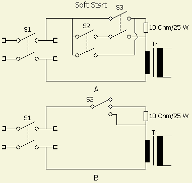 Het maakt niet uit in welke volgorde S2 en S3 (fig A) ingeschakeld worden want steeds zal eerst een begrenzingweerstand in serie met de trafo staan. Het is een kwestie van klikklak en dat geeft al een voldoende vertraging. Ook systeem fig. B werkt naar behoren en dat gebruik ik in mijn losse 3 kV experimenteer voeding. Vergeet niet om bij het uitschakelen van de voeding ook S2 en S3 terug te zetten!