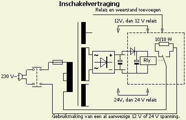 Het relais komt vertraagd op omdat eerst de elco's op spanning komen, vervolgens sluit het aan de primaire kant van de transformator een weerstand kort. De vertraging kan men anders instellen door met de waarden van 10 Ω en 1000 µF te spelen. Let erop dat de schakeling op geen enkel punt contact maakt met massa.