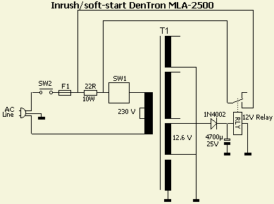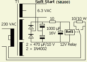 Een eenvoudig inschakelvertraging of "soft start" ziet u («fig») hiernaast. De hoofdschakelaar is S1. Het HV deel wordt apart geschakeld. Dat geniet mijn voorkeur en als ik de shack verlaat zet ik uit voorzorg HV af. De huisgenoten zijn niet deskundig en je weet maar nooit!