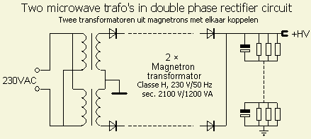Uit veiligheidsoverwegingen is het beter om twee dezelfde magnetron trafo's te verzamelen. De verbinding hoeft dan niet losgemaakt te worden als een dubbelfasige (fig») gelijkrichting met middenaftakking toegepast wordt. |