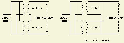 Dikwijls is het voordeliger om twee gelijke secundaire spoelen parallel te schakelen en dan de spanning gelijk te richten en te verdubbelen. Is er bij voorbeeld 2 × 1200 V en elke spoel heeft een weerstand van 50 Ω, dan is dat met de spoelen in serie 100 Ω en parallel maar 25 Ω. Ik heb daar grondig mee geλxperimenteerd. Wat bleek? Door de kleinere inwendige weerstand kan onder volle belasting een 100 V hogere spanning verkregen worden dan met beide spoelen in serie en gelijkrichting door een brug met vier diodes.