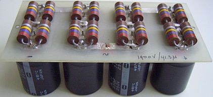 De weerstanden worden bij mij altijd in kanteelvorm aan de koperzijde van een printplaat gemonteerd en de elco's komen aan de andere kant. In dit voorbeeld werden vier rijen van twee condensatoren in serie gezet. Er werden in plaats van drie, twee weerstanden parallel over de elco's geplaatst omdat het 2 W types waren en de onbelaste spanning maar 1900 V= was.