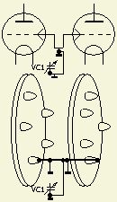 SM6AZZ vroeg mij waarom in een OM-Amplifier http://www.om-power.com/img/pi_and_tube_25hf.jpg een RFC zat met een middenaftakking. Dat was voor mij de eerste keer dat ik zoiets tegenkwam. Het lijkt mij een slim idee dat wel een extra segment van een bandschakelaar vergt. Omdat ik verder geen gegevens van de versterker bezit, filosofeerde ik er maar op los en werd het bovenstaande schema getekend. Kennelijk is voor de hogere banden de capaciteit van de wikkelingen onderling te groot of zijn er ongewenste dippen, zodat met de bandschakelaar een gedeelte kortgesloten wordt. De condensator C zorgt ervoor dat de bandschakelaar gescheiden is van de gelijkspanning.