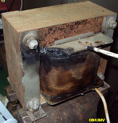 ON4JMV scrheef mij: "Ik was bijna klaar met een lineair met een GU-43B gebouwd volgens uw aanwijzingen, maar daar de buis al een hele tijd niet gebruikt was wilde ik deze ontgassen door deze een hele nacht te laten opstaan. Uiteraard met de gloeispanning, maar ook de hoogspanning trafo stond onder spanning. Dit was in een weekend van zaterdag op zondag. Zondag ging ik 'smorgens eens zien of het ding nog opstond maar er bleek in de zekeringkast een zekering gesprongen. Ik zet deze terug op en het ding startte terug normaal op, maar na enkele seconden hoorde ik een vreemd sterker wordend geronk, meteen had ik het door dat de hoogspanning trafo aan het doorbranden was. Er ontstond een lichte rook ontwikkeling en ik had toevallig mijn camera bij de hand en nam in een reflex een paar foto's, maar bij de derde foto stond het boeltje in de fik! En het ergste van al was dat de zekering nu niet uitvloog! Dus dit kon ook 'snachts gebeurd zijn met alle nare gevolgen van dien, met de brandweer erbij en zo.......