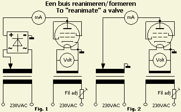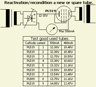 Bij onder ander een 3-500Z kan reactiveren betrekkelijk eenvoudig. Met een gelijkspanning van 30 à 40 V heeft men voldoende om de buis 400 mA te laten trekken als het rooster met de anode verbonden wordt. Laat de buis eerst een half uur aanstaan met alléén 4.9 V op de gloeidraad. Daarna komt de "hoogspanning" van ongeveer 35 V erop en regelt men dat af op een anodestroom van 400 mA. Meestal laat ik het reactiveren niet langer duren dan een uur of zo.