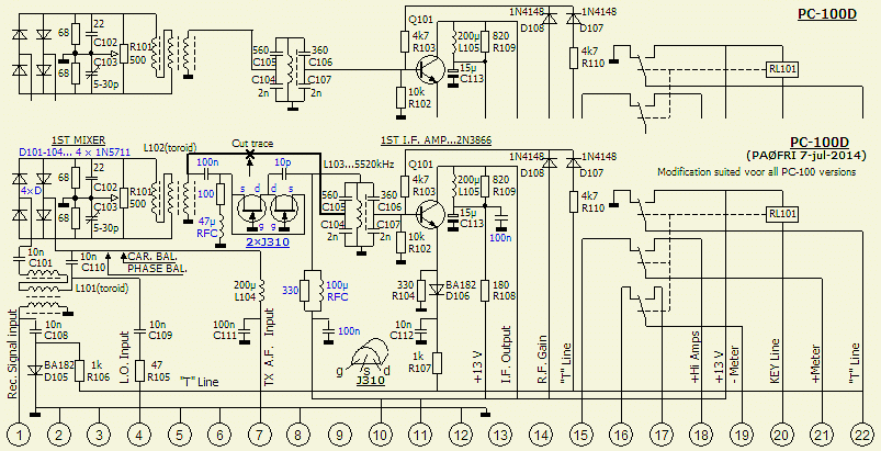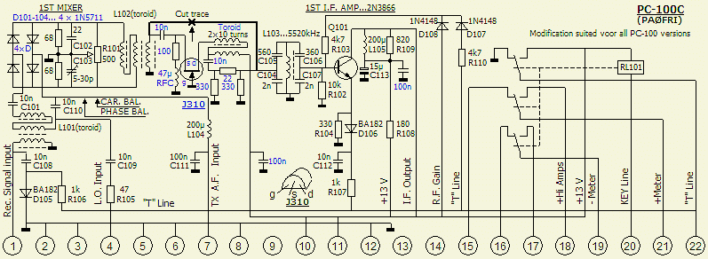 Het is gedaan met een FET in geaarde gate schakeling. Het is toepasbaar voor alle PC-100A t/m PC-100D printen. De afgestemde kring (L103) heeft in manuals niet hetzelfde nummer. Ook de kerntjes en condensators zijn per printtype anders en dat is in bovenstaand schema als extra informatie ingetekend. De gegevens heb ik overgenomen van de in mijn bezit zijnde originele PC-100 printen.