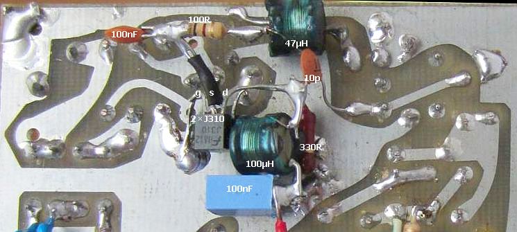 Aanvankelijk werd aan de ingang een lage SWR verkregen met één J310, maar met een (fig») tweede parallel, was de SWR nog beter!