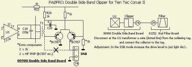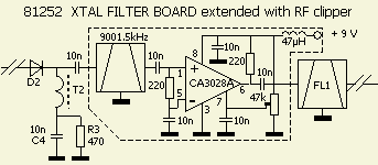 Een van de methodes om het gemiddelde vermogen van een zender te verhogen is het begrenzen van een HF signaal. Dat kan met een enkelzijband (SSB) of met een dubbelzijband (DSB) signaal en beide systemen zijn even effectief. Hier werd voor DSB gekozen om een tweede filter uit te sparen. Het DSB (IF) signaal van de modulator wordt in een differentiaal schakeling met twee transistors begrensd. Er ontstaan intermodulatie producten en het smalle SSB filter op het XTAL FILTER BOARD (81252) voorkomt het uitzenden van een breed spectrum. Er is iets meer HF vervorming dan met een geclipt SSB signaal, maar met een gematigde microfoon versterking is daar niets van te horen terwijl de gemiddelde output behoorlijk toeneemt. Eventueel kan men met R26 of de extra 1 k? basisweerstand het signaal aan de uitgang regelen voor een juist niveau voor het kristalfilter. De in het schema getoonde waarden bleken hier goed te voldoen.
