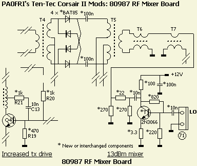 Uitsluitend voor mijn eigen experimenteel radio onderzoek werd de RF dubbel gebalanceerde diode ringmixer op een niveau van ongeveer 13 dBm gebracht. Boven de RF Mixer Board (80987) print werd een "zwevende" zelfdragende breedbandige versterker met verzwakker aangebracht tussen de mixer en de voortrap. De 50 ? in en uitgangsimpedantie van deze 2N3866 versterker werden experimenteel bepaald met een antenne analysator. Omdat de eigenschappen van de originele mixer hier niet bekend waren, werden voor de zekerheid BAT 85 Schottky diodes gemonteerd. Als de modificatie niet naar tevredenheid zou werken kon zonder zichtbare schade de originele schakeling gemakkelijk weer hersteld worden. Omdat de wijziging goed werkte, is alles tot nu toe zo gebleven. Alleen de noise blanker werkt niet meer 100% door het hogere signaalniveau. Maar dat is hier geen probleem want de blanker wordt bijna niet gebruikt. Dat systeem veroorzaakte al voor de modificatie teveel intermodulatie van een binnenkomend signaal. Waarschijnlijk kan het hogere niveau gecompenseerd worden door in serie van elke diode in de noise blanker nog een diode te plaatsen maar dat is hier nog niet getest.