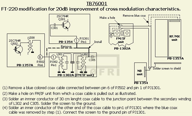 Het is waarschijnlijk niet bij alle eiganeren van een FT-220 bekend dat er van YAESU een technisch bulletin TB76001 bestaat. Het gaat om een 20 dB verbetering met betrekking tot kruismodulatie. Zo gek is dat nog niet want origineel wordt de noiseblanker direct aangestuurd door de RF/MIX unit en met de verandering pas na een 10.7 MHz filter.