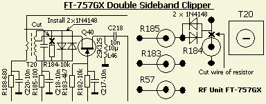 De («fig) drain van Q40 is belast met IF transformator T20 en weerstand R184 (10k). Met 2 × 1N4148 antiparallel geschakelde diodes over kring T20 wordt, bij voldoende sturing, het middenfrequent signaal begrensd. Het daarop volgende kristalfilter zorgt ervoor dat ongewenste produkten onderdrukt worden. Het signaal in de drain bleek van voldoende sterkte om een redelijke effectieve begrenzing te verkrijgen. Het werd nog beter als de dempende weerstand R184 verwijderd werd. Hier werd dat gedaan door aan de bovenkant één poot door te knippen. Demping vindt nog steeds plaats wanneer de diodes over gaan tot begrenzen. Het resultaat van dit eenvoudige systeem is niet spectaculair, maar werkt beter dan de originele AF processor. Bovendien heeft men bijna nooit in de gaten dat er een clipper in het geding is, zodat het permanent ingeschakeld kan blijven. De drukknop voor de processor kan eventueel voor iets anders gebruikt worden en de mate van begrenzing regelt men met de MIC volumeknop.