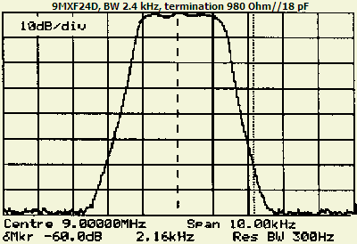 Het middenfrequent filter is een 9 MHz YAESU type XF-90A. Het is 2.6 kHz breed en de draaggolf frequenties zijn 8998.5 kHz en 9001.5 kHz. In mijn set kreeg ik een gelijkluidende klank met USB en LSB en dezelfde "kerstboompjes" op een scoop als de beide draaggolven ingesteld werden op 8998.3 en 9001.5 kHz.