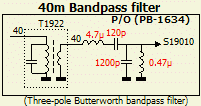 Als er op 40 m nog signalen doorkomen van sterke buiten de band liggende zenders, dan kan men op P/O (PB-1634) de 40 m ingangskring T1922 uitbreiden tot een bandpass filter (BPF). Daartoe verbreekt men de draad van T1922 naar de bandschakelaar en wordt de schakeling (fig») ertussen gemonteerd.