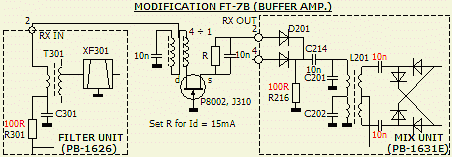 De middenfrequentie is 9 MHz en de ontvanger is uitgerust met enkele conversie en een dubbel gebalanceerde mixer met Schottky (1SS16) diodes. Alleen de afsluiting naar de ingang van een afgestemde kring (T301) met een filter (XF301) is niet breedbandig uitgevoerd. Daarom werd een bekende bufferversterker aangebracht. Dat is vrij eenvoudig. Het coaxkabeltje van PB-1631 (pen 2) naar PB-1626 (pen 2) wordt losgemaakt en de getoonde schakeling, met aan beide zijden de kabel, ertussen geplaatst.