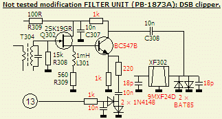 De voorgaande schakeling kan uitgebreid worden tot een IF dubbel zijband clipper/processor om het gemiddelde zendvermogen wat op te krikken. Een echte SSB IF begrenzer met een tweede IF filter is nog mooier, maar daar is vrijwel geen plaats voor in een FT-7 of FT-7B. Zo'n DSB clipper heb ik ook al met succes aangebracht in onder andere een TS-50S.