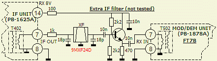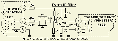 Volgens het originele schema wordt de ingang van het kristalfilter gekoppeld aan een (te) lage source impedantie van Q302 (2SK19GR). Gewoonlijk moeten dergelijke 9 MHz filters aan de in en uitgang een reflectievrije impedantie zien van 500 Ω. Door het monteren van een transistor met een factor 1 versterking en een 470 Ω collectorweerstand is het filter op de juiste wijze belast. Zulke filters moeten eigenlijk aan de in en uitgang ook nog een condensator van 30 pF parallel hebben.