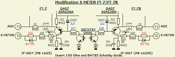 Een meer realistischer S meter aanwijzing verkrijgt men door het toevoegen van een BAT85 Schottky diode en een weerstand van 100 Ω. Merk op dat R429 en C427 niet dezelfde waarde hebben in een FT-7 en FT-7B!