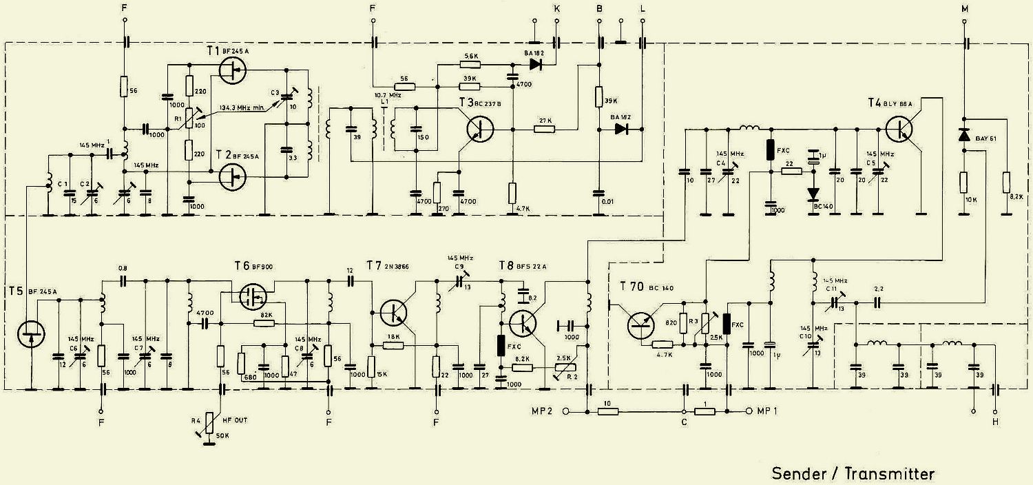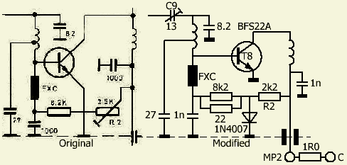This setting improved the control power and for even more drive the 10 Ohm resistor from point C to MP2 was replaced by an 1 Ohm resistor. In the schematic and the image you can see how I installed two resistors and one diode and further a trimmer on the place of a 10 pF capacitor. The 1N4007 is mounted with thermal paste onto the L-profile heatsink to monitor the heating of T8. Actually, that is not necessary because the heat sink keeps the BFS22A at a more or less stable temperature.
