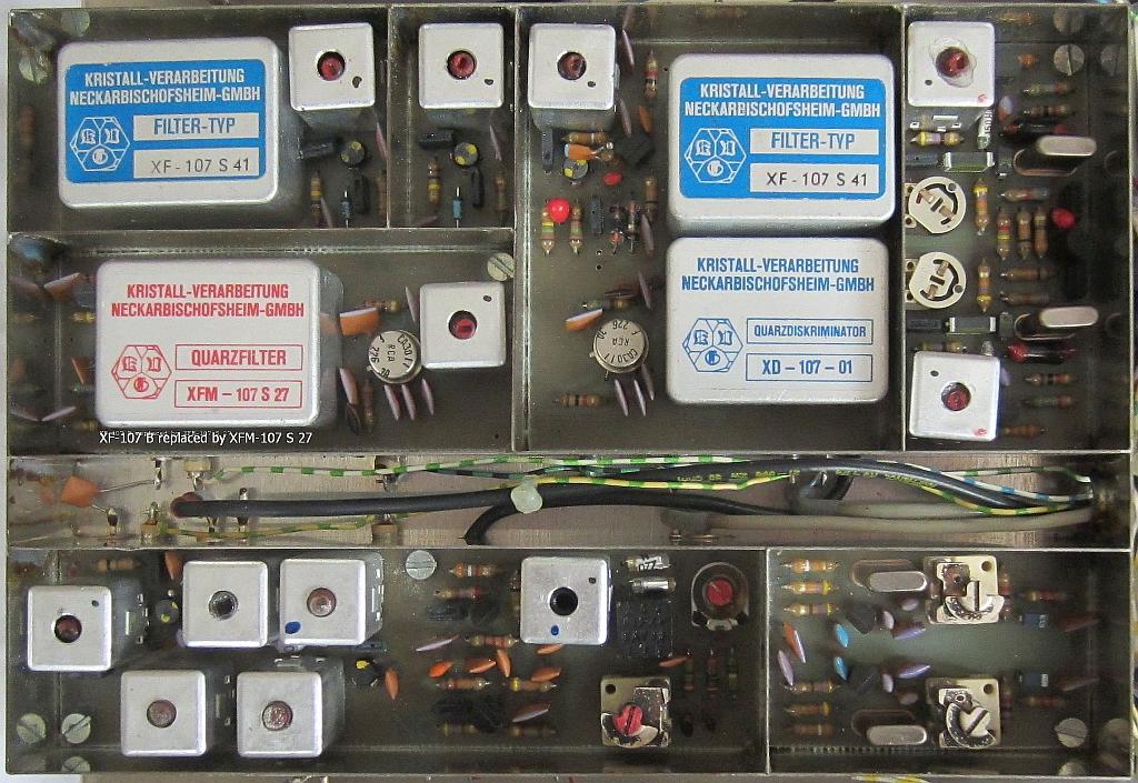 A KVG 10.7 MHz filter XFM-107 S 27 was purchased via eBay. This filter is approximately 15 kHz wide, but is constructed more symmetrically than the original XF-9B filter. That is why it fits better in the 12.5 kHz channel grid and that is noticeable in practice. Without other changes, the old fiter has been removed and the new installed.