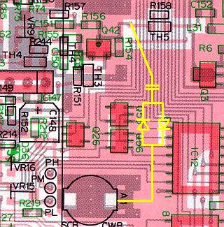 Locate the clipper connection points on the main PCB, near "TH5" and close to L28, and solder, using the threaded bushing A1 as the earth point. |